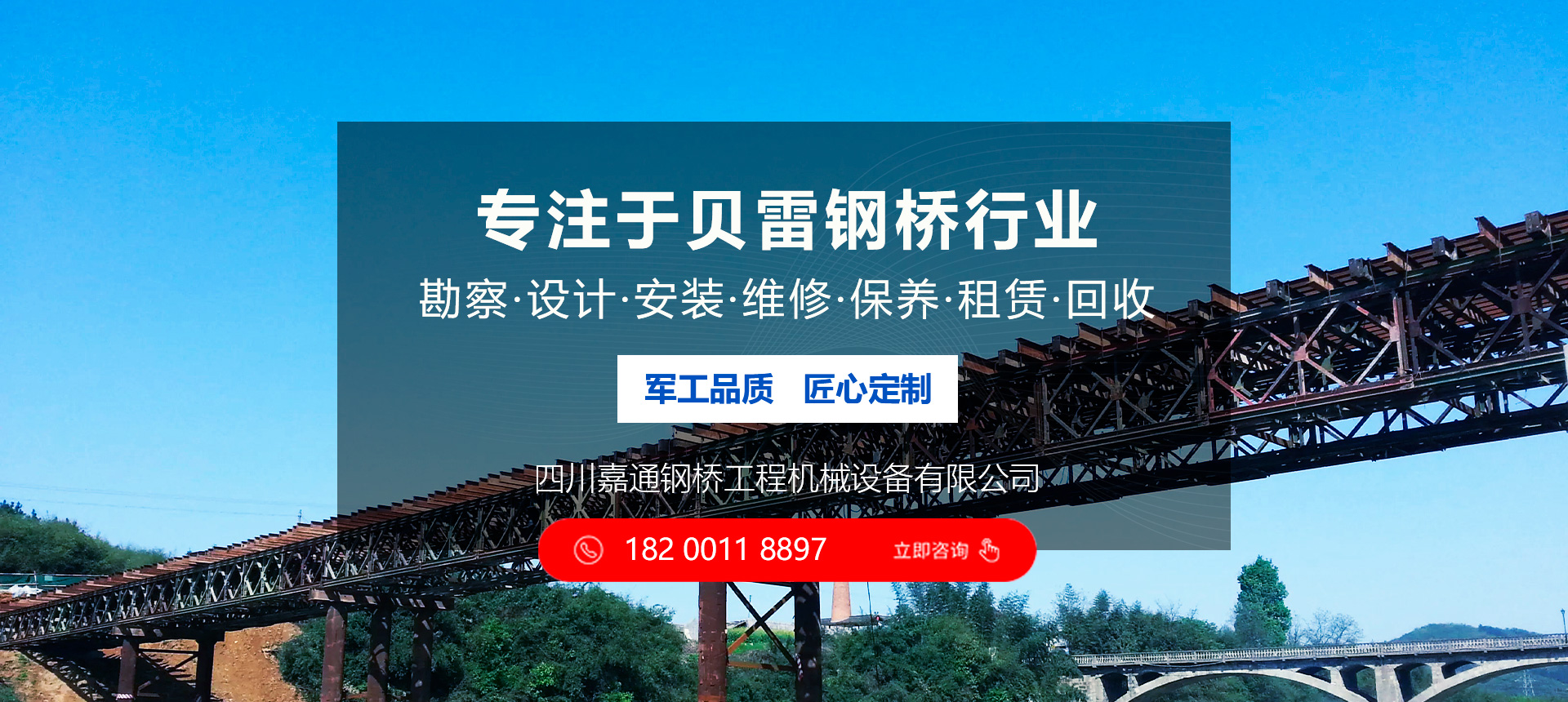 四川嘉通鋼橋工程機(jī)械設(shè)備有限公司坐落于有著天府之國的成都。以成都為中心,西南.西北和華中市場同步發(fā)展,打造中國西南地區(qū)專業(yè)的貝雷鋼橋行業(yè)領(lǐng)導(dǎo)品牌。, 主要從事: 交通鋼便橋的設(shè)計以及生產(chǎn)銷售 材料設(shè)備的租賃 交通安全設(shè)施項目的施工 鋼結(jié)構(gòu)橋梁加工及防腐處理物資設(shè)備等業(yè)務(wù)。   公司堅持 “承諾必須兌現(xiàn)、要約必須履行”的誠信態(tài)度, “質(zhì)量第一、客戶至上”的經(jīng)營理念, 把領(lǐng)先的技術(shù)、卓越的管理和完全以客戶為中心的服務(wù)融為一體,為您提供優(yōu)質(zhì)的產(chǎn)品和完善的服務(wù)。
